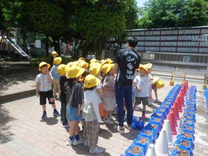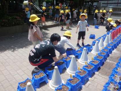 1年2組さんが、朝顔の鉢を移動していました。もう双葉が出ている鉢もありました。
