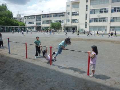 鉄棒で遊ぶ子もいれば、プールの水抜きをしている先生の周りに集まっている子もいました。