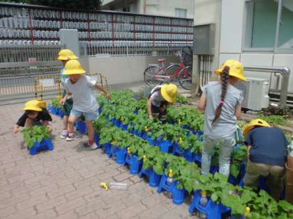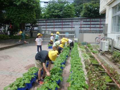 7日の授業風景です。1年1組は外で、朝顔の世話をしていました。