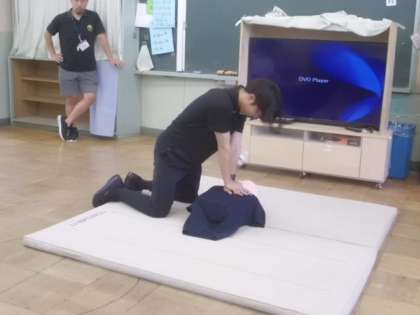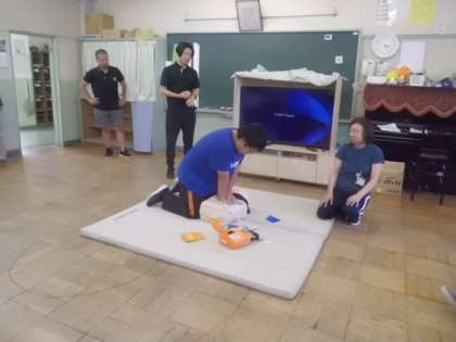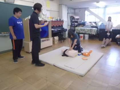 学年ごとに役割分担をして、心臓マッサージやAEDを行います。