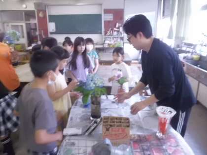 今日は「アジサイの絵」を描くようです。図工室には、色・形の違ったアジサイが並んでいました。