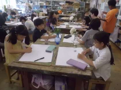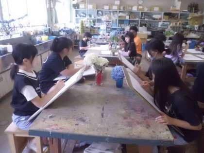 各机に2つのアジサイを置き、熱心に描いています。
