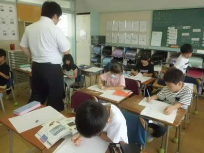 子どもたちは、事前に調べてきたメモをもとに、クイズ形式の発表シートを作っていました。
