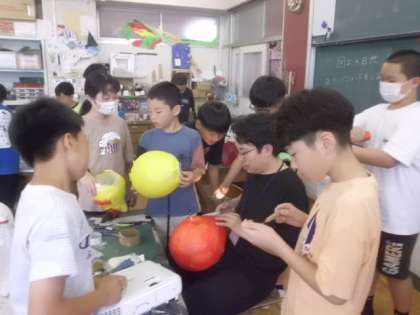 6年2組は図工でした。日光移動教室「キャンドルファイヤー」で使うランプシェードを作成していました。
