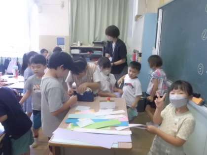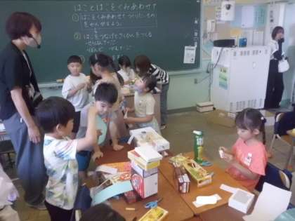 1年3組です。「箱を重ねて作る○○」思い思いの作品を作っていました。