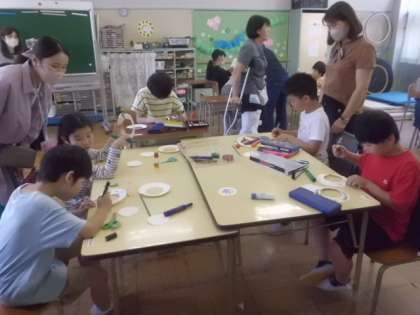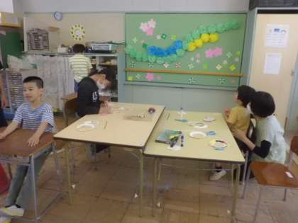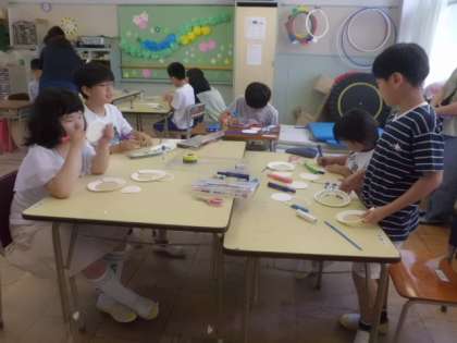 わかば学級では図工をしていました。紙皿を使って、「風車」を作っていました。