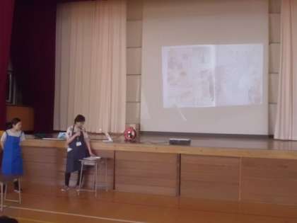 学校司書の先生が、給食ができるまでを描いた本を読み聞かせしながら、実施に栄養士の先生がお話をしてくれていました。
