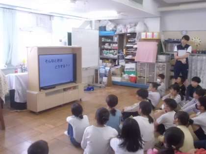 実際に体験する前に、DVDを見て、溺れた場合にどのようにすれば良いかを事前学習しました。