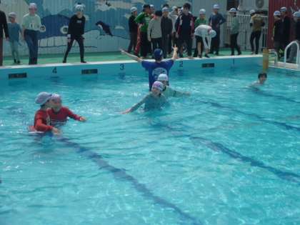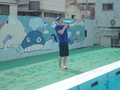 続いて、実際にプールに入って、動きづらさを体感しています。