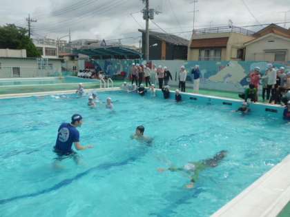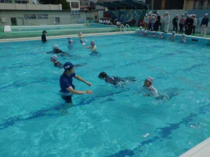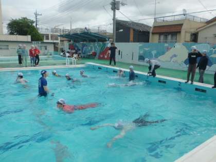 次に、平泳ぎで泳いでみました。平泳ぎの方が、少し泳ぎやすいことが実感できたようです。