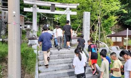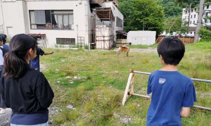 これから、クラス毎に分かれ、温泉神社と源泉と足湯に行きます。いきなり、鹿のお出迎えです。人を怖がる様子はありません。