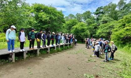 赤沼手前では、ある実験をしました。湿原に積もった堆積物が踏み固められた場所で一斉にジャンプをすると、下にいたクラスの子たちの足に、大きな振動が伝わります。