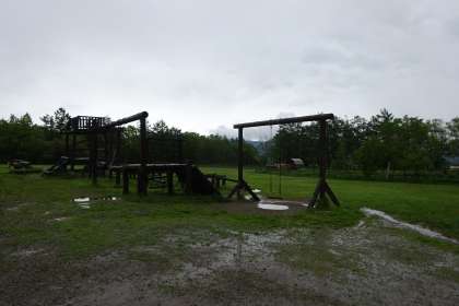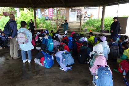 たきに到着しました。移動途中、雨模様だったので、レインコートを着て外に出ましたが、ほとんど雨も降っておらず、5年生の強運に感心しました。