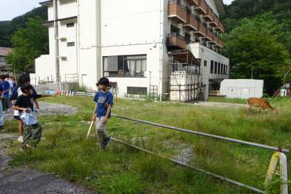 避難訓練を終え、ナイトハイクの下見も兼ねて、源泉と足湯に行きました。途中、さっそく鹿が出迎えてくれました。