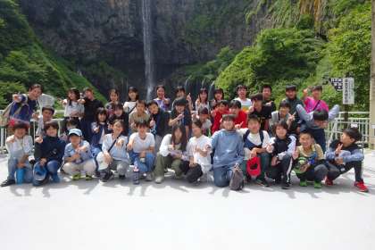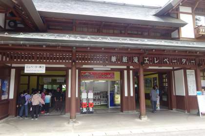 華厳の滝に到着。エレベーターで降り、観瀑台でクラス写真を撮りました。