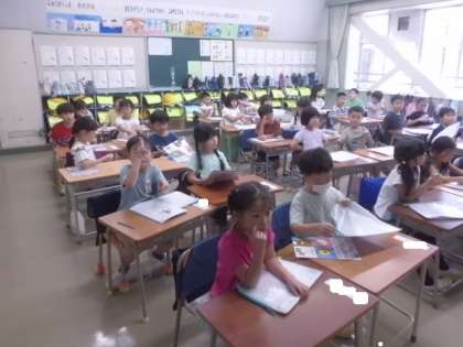 1年2組です。こちらもお手紙を配っていました。
