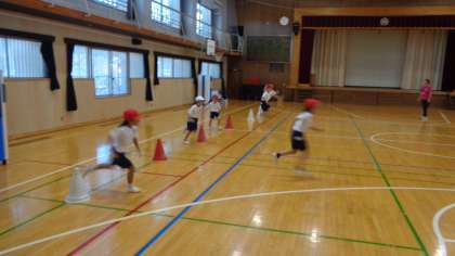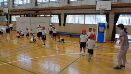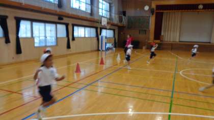 体育館では1年3組がいろいろな走り方をしながら、走の運動をしていました。
