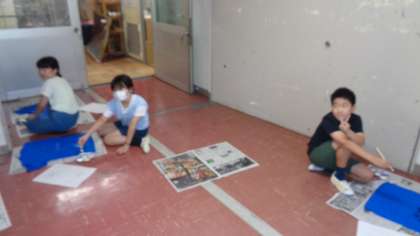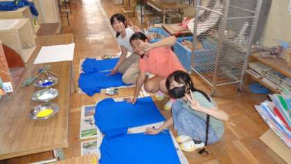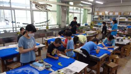 図工室をのぞくと、5年1組が運動会のソーラン節で使うTシャツ作りをしていました。