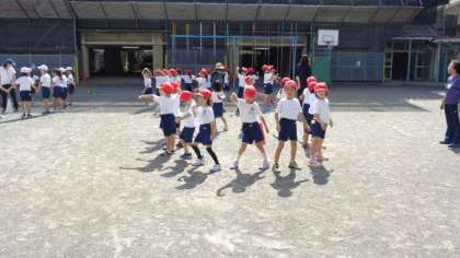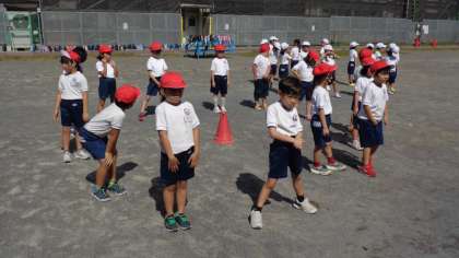7日(月)、1・2年生が校庭で、運動会のダンス練習をしていました。