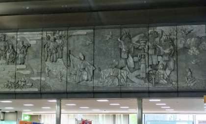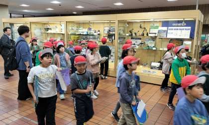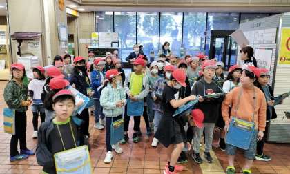 市役所見学も最後になりました。ロビーにある彫刻には八王子市のマークが隠されていることも教わりました。
