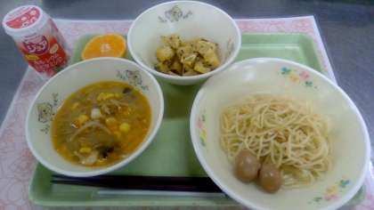スープは削り節とにぼしからじっくりだしをとり、たっぷりの7種類の野菜を入れ煮込みました。