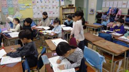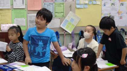 色紙を切り取り、操作しながら正方形について特徴を発表していました。