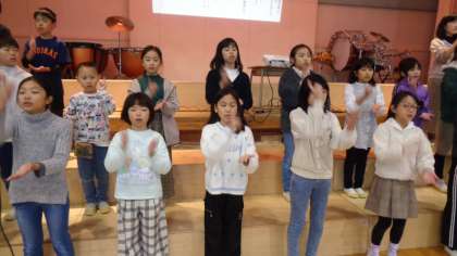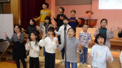全校合唱で歌う「世界がひとつになるまで」を歌いました。前には35人に増えた合唱団の子がいます。