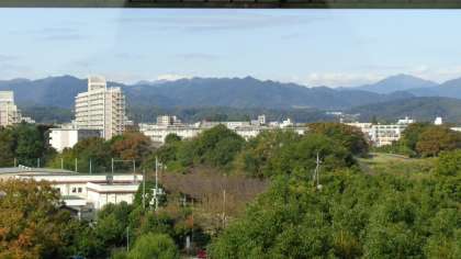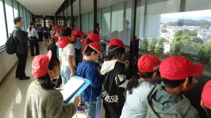 市役所の渡り廊下から、市内の景色の特徴を見学しました。西側には山々が連なっていました。