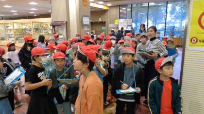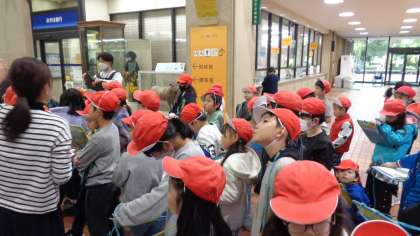 最後は1階の見学です。奥に見える彫刻板に隠された八王子市のマークを見つけ、みんな喜んでいました。