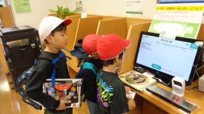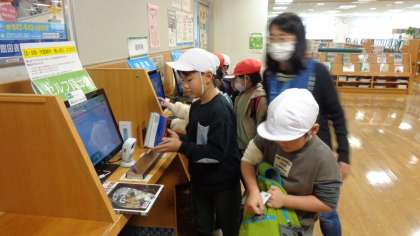 図書館にはセルフ貸出機もありました。操作の仕方を教えてもらい、自分たちで本を借りていました。