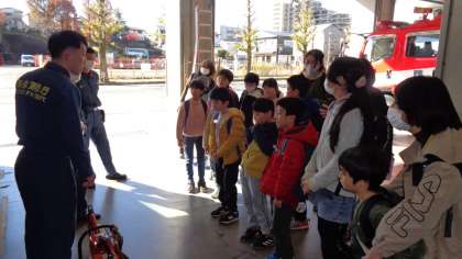 はじめに、車庫に入っている消防車や救急車、レスキュー車などを見させてもらいました。担当の方がついて、積まれている機材の説明をしてくださっています。