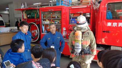 耐熱消火服も、その場で着てくださいました。素早い動作であっという間に着用していました。子どもたちからは拍手が起きていました。