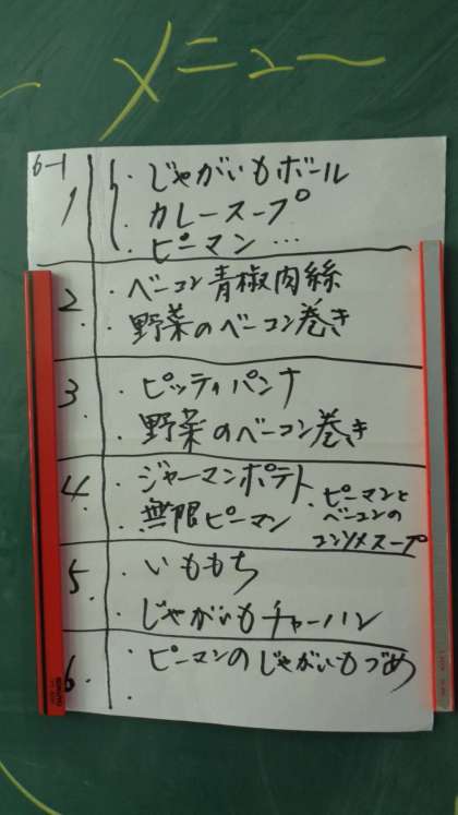 どの班も、材料(ジャガイモ4こ、玉ねぎ1こ、ピーマン3こ、ベーコン6枚)は同じで、メニューは班で決めました。