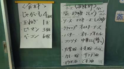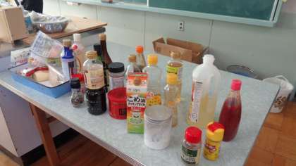 本日は6年2組の調理実習風景です。写真のような材料と調味料を使い、班ごとにメニューを考え作りました。