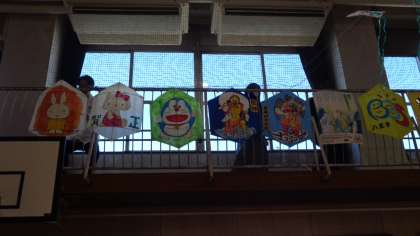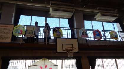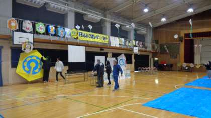 体育館ギャラリーには、たくさんの凧が飾られ、準備が進んでいます。