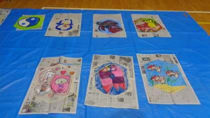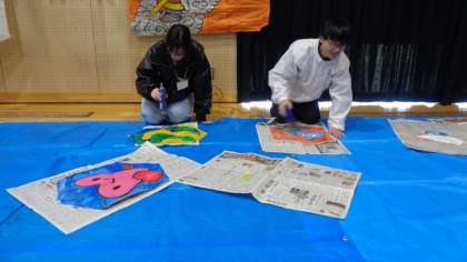 描きあがった凧絵を、BBS会の方がドライヤーで乾かしてくれています。ありがとうございます。
