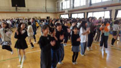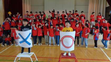 6年生にアンケートを行い、それを基にした「○×クイズ」です。シンキングタイムは「ハイ、喜んで!」の音楽に合わせて、3年生が踊ってくれます。