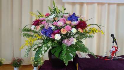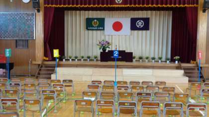 4月8日(火)、満開の桜が咲く中、令和7年度の入学式が行われました。子どもたちの入場を待つ、朝の体育館です。
