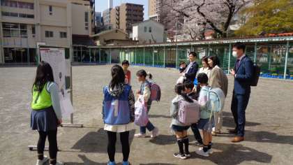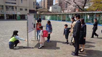 クラス分け表の表示板に6年生がついてくれて、保護者や1年生を案内してくれています。紙の下側がめくれて、見づらくならないようさりげなく押さえてくれる6年生たちです。今年も6年生の活躍が楽しみです。