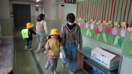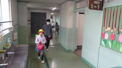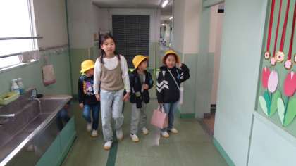 昇降口から6年生が一緒に教室まで連れてきてくれています。