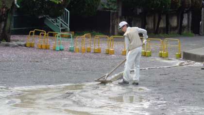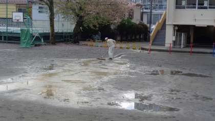 昨日の雨で校庭中央は水たまりができていました。用務主事さんが校庭をならしてくれています。