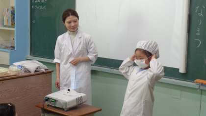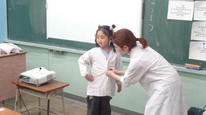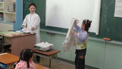 給食の白衣の着方、たたみ方も教わりました。