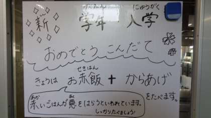 今日は、入学・進級を祝うお赤飯と、子どもたちの大好きな鶏のから揚げです。
