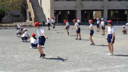 1組の横では、6年3組がなわとびの練習をしていました。二重跳びリレーに挑戦していました。