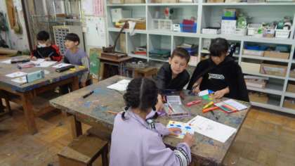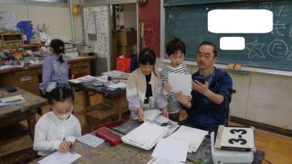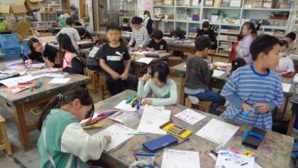 図工室では、新しく来られた図工の先生が、3年3組の子どもたちに授業をしていました。自分の名前を使ってデザイン画を描いていました。