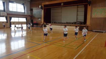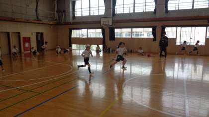 3年1組の子が、体力調査の一種目「20mシャトルラン」に挑戦中でした。「○○回走れたよ。」「おでこさわってみて。」と息を弾ませながら、報告に来てくれました。