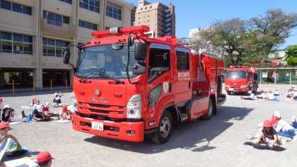 21日(月)、2年生がはたらく消防写生会で、消防自動車の絵を描きました。