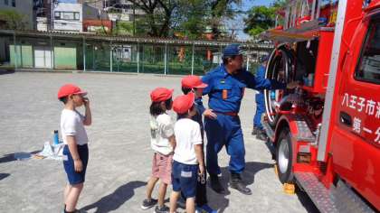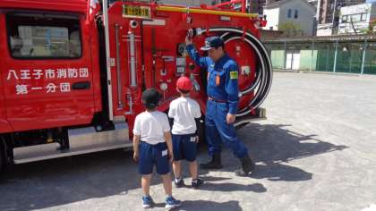 早く描き終わった子に消防団の方が消防車の説明をしてくださっていました。