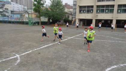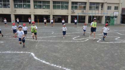 黄色いゼッケンをつけた6年生が伴奏役をしてくれています。1年生もよく頑張りました。