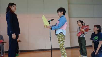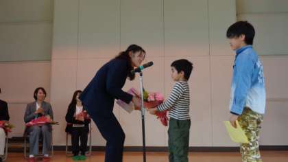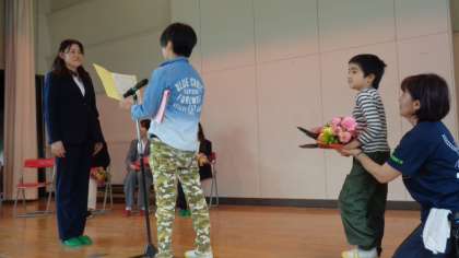 前わかば学級担任の先生です。手紙と花束を渡すのはわかば学級の子どもたちです。